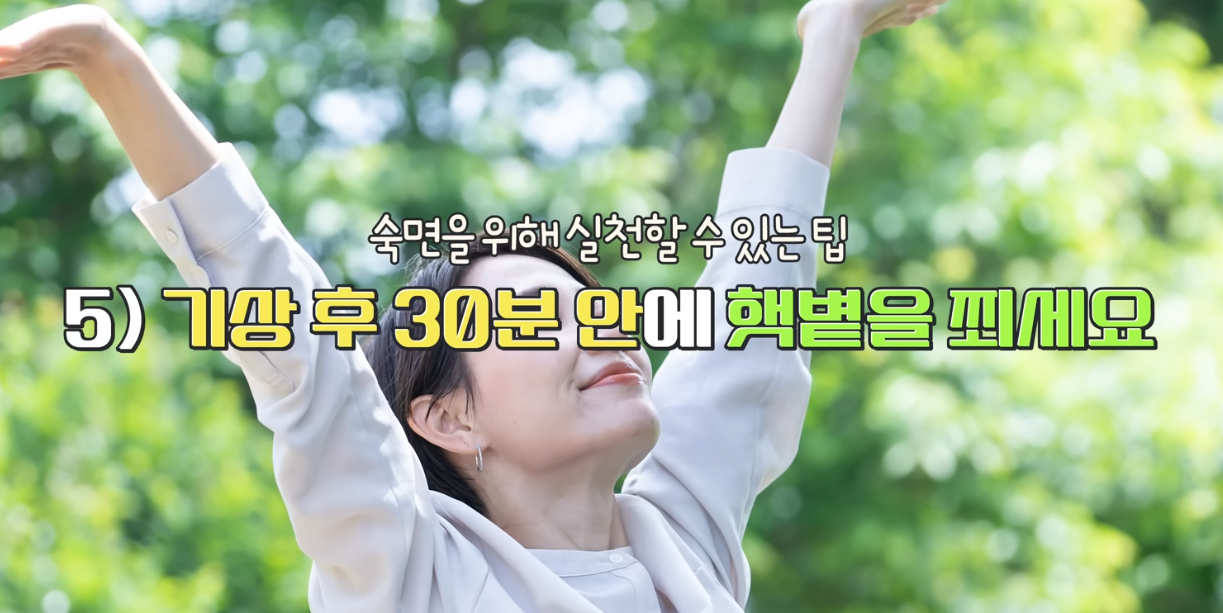 - 기상 후 30분 이내 햇볕 쬐기: 필수: 멜라토닌 분비 주기를 조절하여 밤에 숙면을 유도합니다.