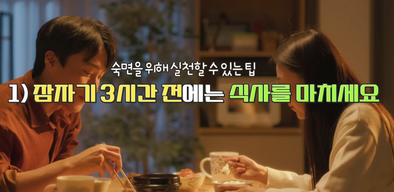 - 잠자기 3시간 전 식사 끝내기: 핵심: 위장이 쉴 수 있어야 간과 뇌도 제대로 회복합니다. 야식은 금물!