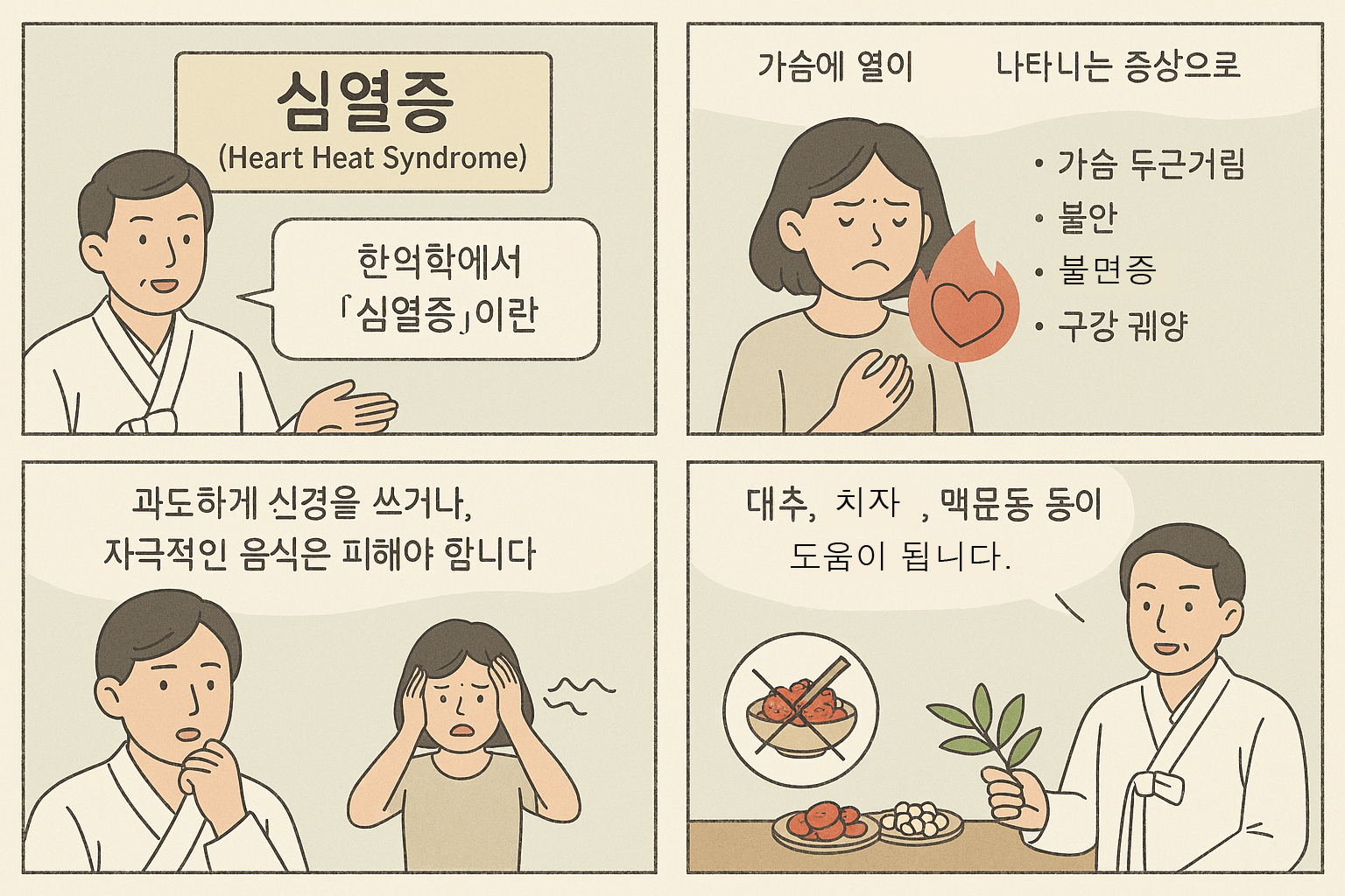 해당 글에서는 실제 임상 경험을 바탕으로 심열 증상을 구체적으로 나열하고, 이를 완화시킬 수 있는 한방차, 마사지, 생활 습관 개선 방법까지 상세히 소개할 예정이다.