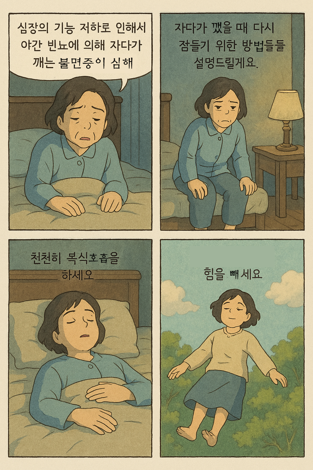 | 복식호흡, 명상으로 긴장 완화 | 족욕, 수분 제한으로 야간 빈뇨 완화 | 자기 전 간식으로 혈당 안정 |