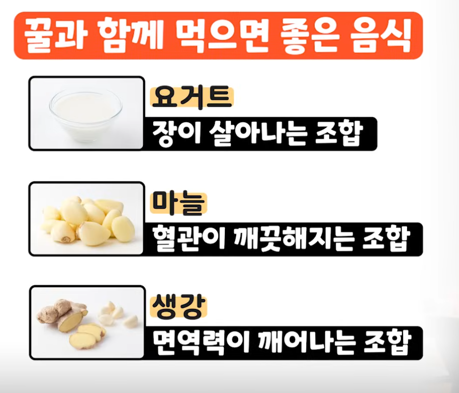 - 3. 꿀+생강: 체온을 높이고 면역력을 강화하여 환절기 건강에 도움을 줍니다. (얇게 슬라이스 후 방치)